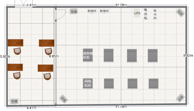 如圖所示,機(jī)房?jī)?nèi)劃分為設(shè)備區(qū)和操作區(qū)兩個(gè)功能區(qū)域,操作區(qū)面積為9m*4.4m約39平方米,設(shè)置4個(gè)席位的工作臺(tái)。設(shè)備區(qū)面積為9m*11.8m約106平方米,設(shè)計(jì)機(jī)房?jī)?nèi)共布置4個(gè)網(wǎng)絡(luò)機(jī)柜、4個(gè)服務(wù)器機(jī)柜,用于放置網(wǎng)絡(luò)、廣播、監(jiān)控、一卡通、服務(wù)器及存儲(chǔ)設(shè)備,后續(xù)設(shè)備擴(kuò)展可以再增加機(jī)柜?;究梢詽M足現(xiàn)在以及將來(lái)5-10年內(nèi)的機(jī)房設(shè)備安裝需要。
