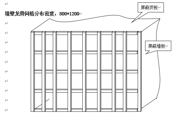2、在安裝屏蔽層之前首先搭建支撐龍門(mén)框架,金屬龍骨架材料采用10#“C”型鋼,金屬龍骨落地力點(diǎn)應(yīng)借助建筑墻體,從而減少整個(gè)樓層載重負(fù)荷。龍骨轉(zhuǎn)接安裝點(diǎn)與建筑墻體接觸點(diǎn)需絕緣處理。頂部龍骨的固定采用吊拉的方式。