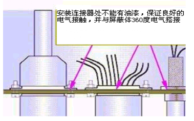 屏蔽電纜的屏蔽層兩端必須將芯線完整的覆蓋起來(lái),電纜兩端的連接器外殼必須能夠與電纜所安裝的屏蔽體360°